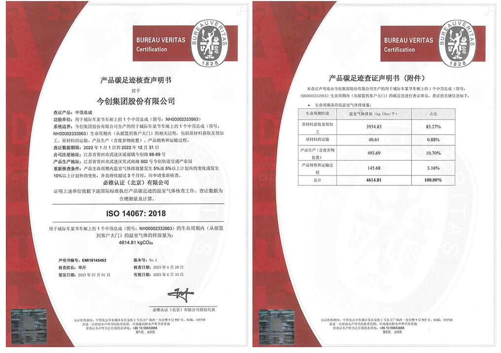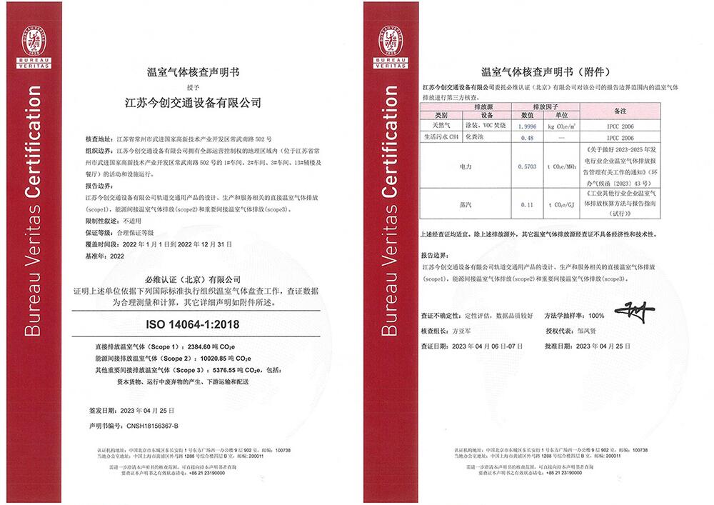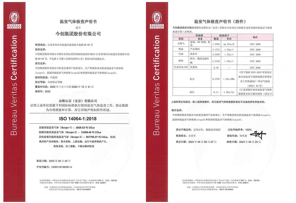 近日,今创集团取得了由必维认证核查并授予的ISO14064温室气体排放核查声明证书以及ISO14067碳足迹证书,为公司提升碳管理水平、践行“双碳”战略奠定了坚实的基础。近年来,我国正加速构建“绿智融合”的多层级交通枢纽体系,行业智慧化、低碳化趋势愈发明显,今创作为轨…
