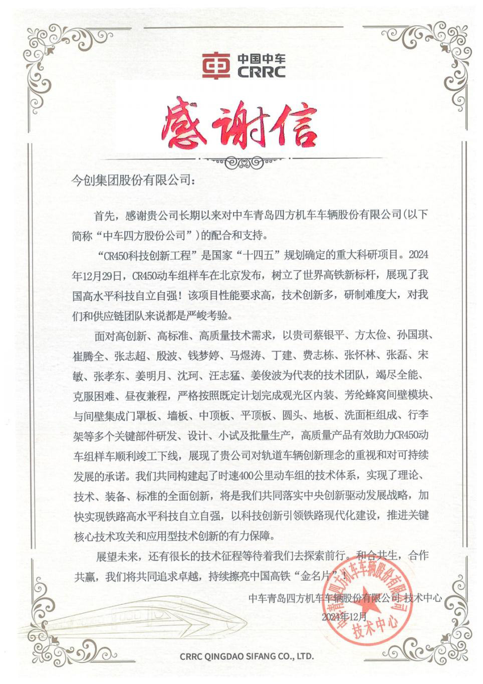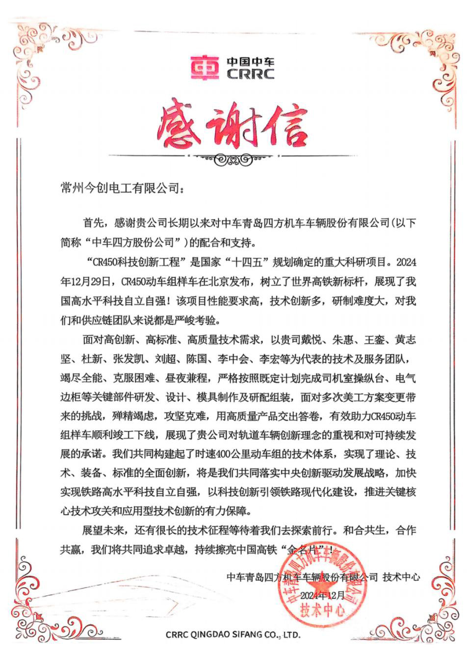 为肯定集团“在CR450科技创新工程”项目中作出的贡献,中车四方股份公司向今创集团及旗下今创电工发来感谢信。信中指出,面对高创新、高标准、高质量技术需求,今创集团技术团队竭尽全能、克服困难、昼夜兼程,高质量助力CR450动车组样车顺利竣工下线,展现了今创对轨道车辆创新理念的忠实和对可持续发展的承诺。希望双方和合共生,合作共赢,共同追求卓越,持续擦亮中国高铁“金名片”!